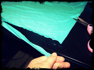 Now you can either trim the seam off the hem or use a loop that broke while stretching for this next part. But basically you want a string made out off a t-shirt loop.